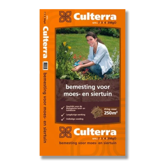 Culterra Oranje 7-3-4+4MgO is de complete, hoogwaardige en milieuvriendelijke meststof voor de gehele tuin of moestuin. Deze Bio Meststof is nummer 1 bij zowel tuinliefhebbers en professionals dankzij de volledig natuurlijke oorsprong van de grondstoffen. Deze volledig organische meststof verbetert de bodemvruchtbaarheid en houdt jouw borderplanten, moestuingewassen en gazon in top conditie. De organische meststof bevat een iets minder voedingsstoffen dan Culterra Groen 10+4+6, maar in plaats daarvan bevat Culterra 3% magnesium. Magnesium is belangrijk voor de aanmaak van bladgroen en behoud van de diepgroene bladkleur. Dit maakt Culterra Oranje ideaal als nabemesting voor zowel in de late zomer als in de herfst. De uitgebalanceerde meststof is daarom ideaal voor gazon, moestuin en siertuin!